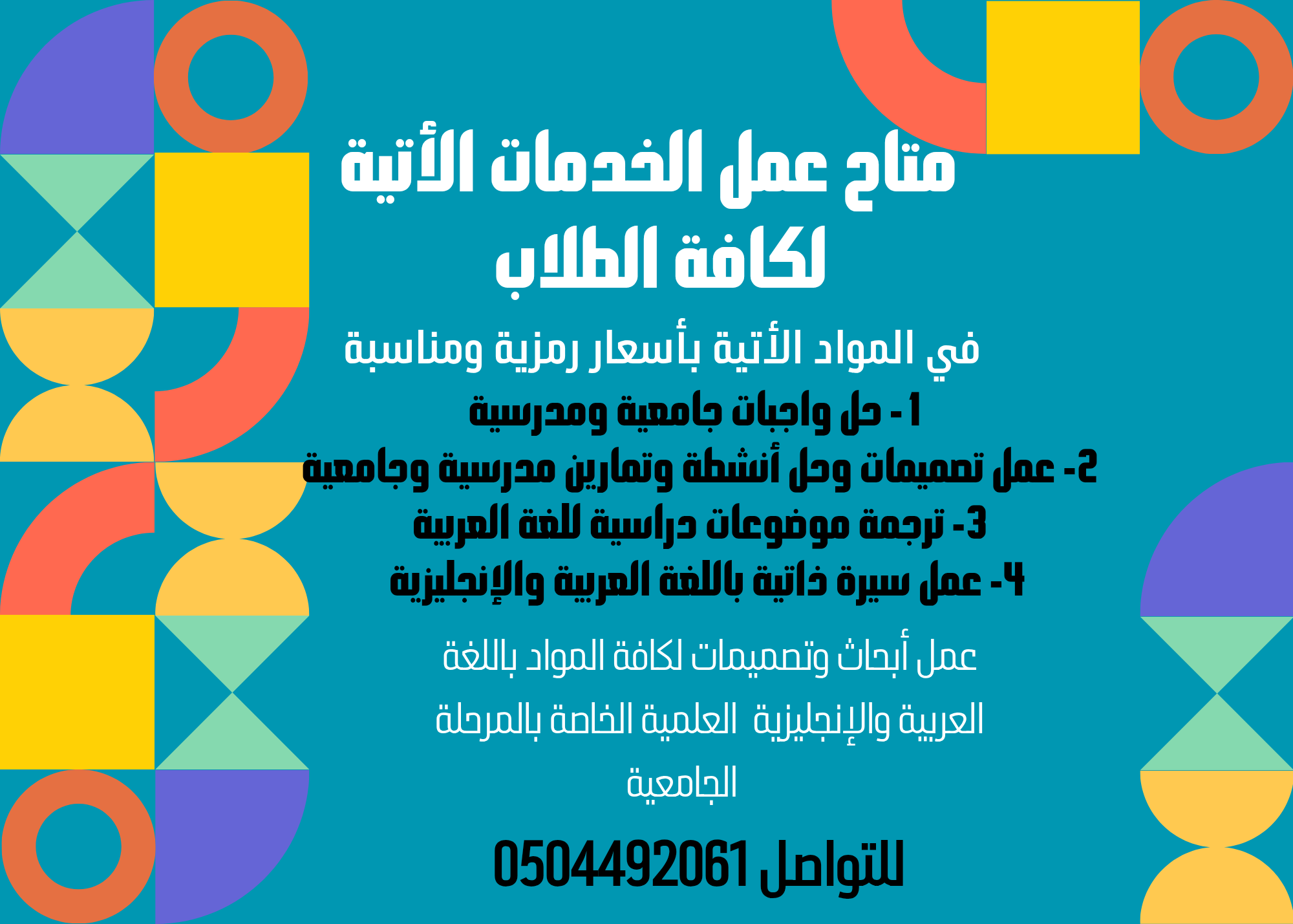 متاح حل واجبات الجامعه وحل أنشطة وتمارين وعمل أبحاث وسيرة ذاتية وتصميمات وملخصات ومشاريع وتقارير وترجمة بأسعار تنافسية للتواصل 0504492061