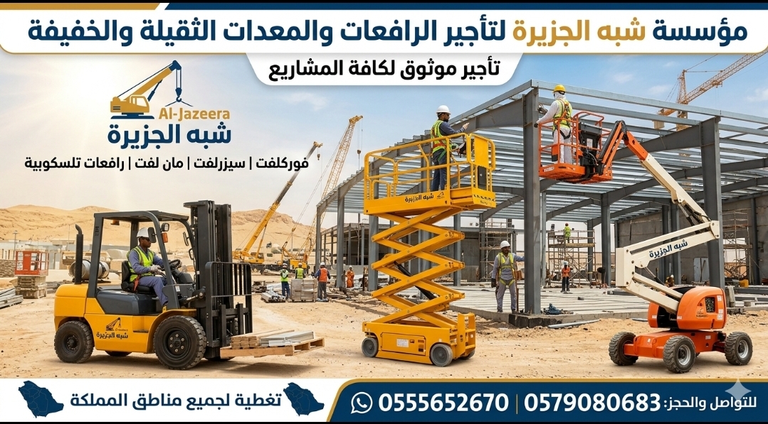 في الرياض، ارفع هياكلك بـ 18m SL Series. بالدمام، تحدَ الرمال بـ 4x4 Scissor Lifts. في جدة، دقة للفنادق مع Narrow Aisle models. توصيل فوري، صيانة 24/7، تدريب مجاني. سيزرلفت للإيجار & رافعات مقصية للإيجار & بالرياض والدمام وجدة || 0555652670 🤳 || سقالات كهربائية للإيجار || شبه الجزيرة للتأجير >> 0555652670 – مشاريعك تستحق الأفضل!