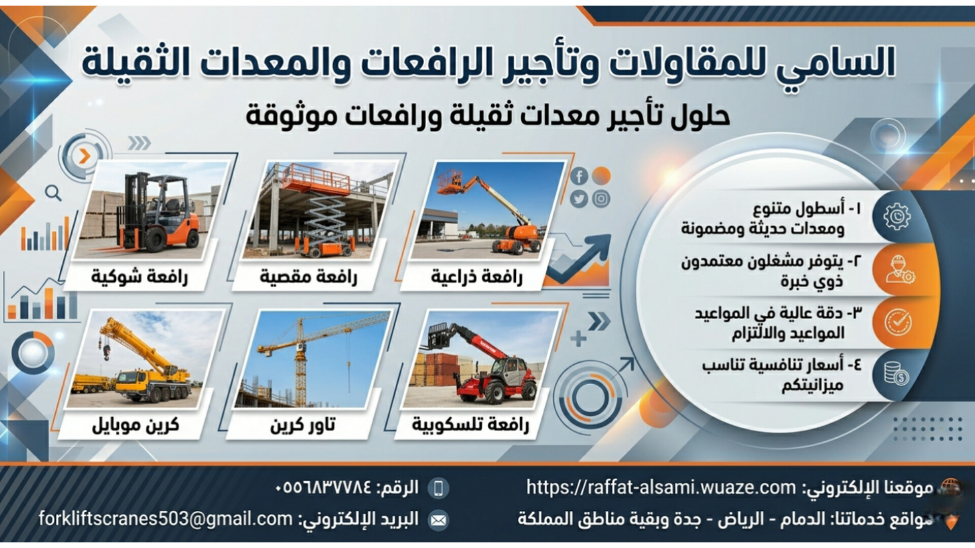 السامي للمقاولات. 0556837784 وتأجير الرافعات والمعدات الثقيلة توفر أقوى خدمات تأجير الفوركلفت والرافعات الشوكية في الرياض بأسطول متنوع من Forklift Rental ورافعة شوكية وفوركلفت ديزل وفوركلفت كهربائي ورافعات شوكية ثقيلة تناسب جميع الأعمال الصناعية والإنشائية والتجارية، بقدرات تبدأ من 1 طن وتصل إلى 25 طن.